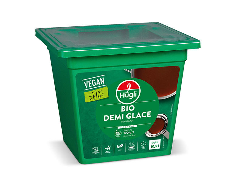 The Hügli brand represents a diverse range of organic products that are produced in an environmentally conscious manner and whose raw materials come from organic farming. Hügli is also committed to implementing the guidelines of the German Nutrition Society (DGE) to promote healthy eating. Hügli's products are characterised by a reduced sugar, salt and fat content in accordance with these guidelines. The silver medal-winning organic demi-glace brown base sauce is vegan and is ideal for classic meat dishes as well as vegetarian/vegan alternatives, making it suitable for use in a wide range of dishes.